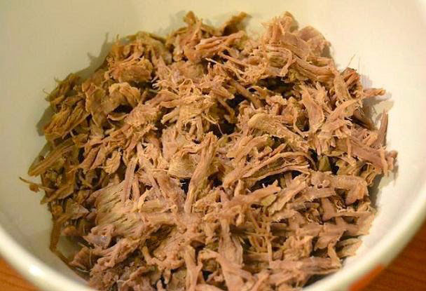 Pentru început, punem carnea la fiert. După ce s-a răcit, o desfacem fâșii.