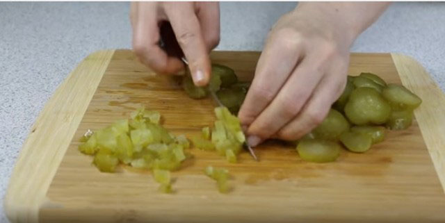 3. Cu ajutorul unui cuțit, tăiem castraveții bucățele.