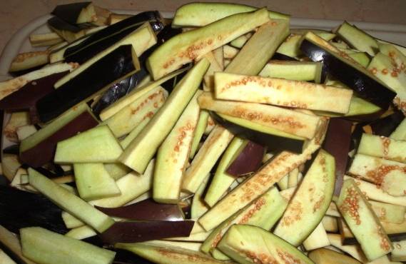 Spălăm vinetele și le tăiem capetele. Apoi le feliem subțire.