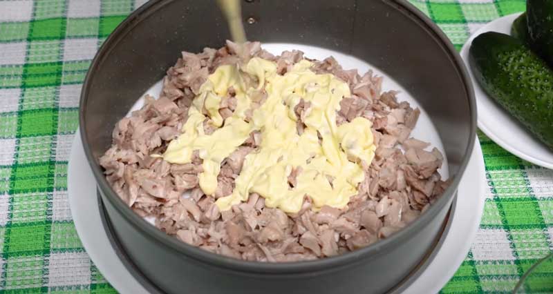 Taie carnea de pui fiartă în bucăți mici și pune-o într-o tavă de tort cu diametrul de 22 cm. Adaugă puțină maioneză și amestecă pentru a acoperi carnea.
