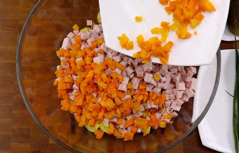 Tăiați morcovii fierți în cubulețe mici și adăugați-i la celelalte ingrediente. Știu că mulți oameni nu prea iubesc morcovii în această salată, așa că îi puteți omite; nu va afecta gustul.
