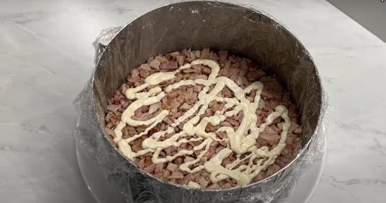 Diametrul inelului meu culinar este de 20 cm. Primul strat al salatei este puiul tăiat cubulețe, presărat cu sare și acoperit cu maioneză.