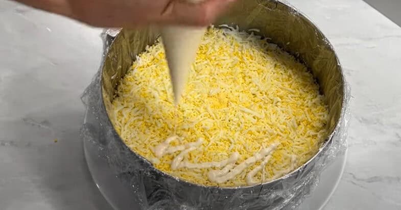 Ouăle fierte, rase, se adaugă ca strat și se acoperă cu maioneză.