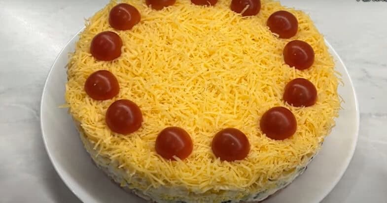 Ultimul strat este brânza rasă. Înainte de servire, salata este decorată cu roșii cherry. Poftă bună!