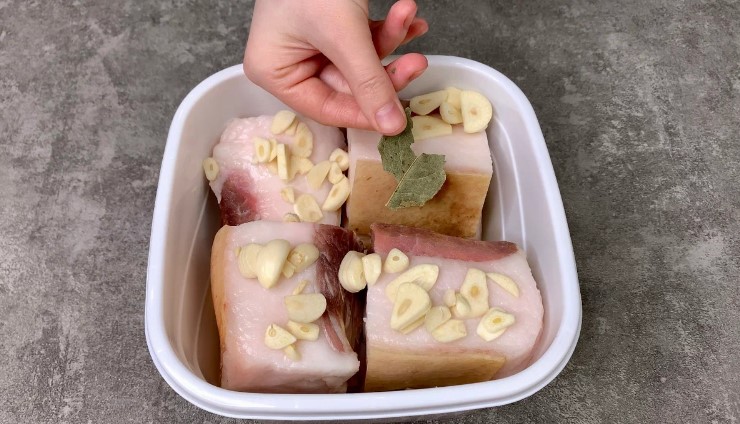 Pe fundul formei se aseaza in slanina taiata si feliile de usturoi, piper negru, alb si rosu, apoi inca un rand de usturoi. Se mai adauga un strat de slanina, se distribuie uniform deasupra usturoiul si se aseaza o frunza de dafin.
