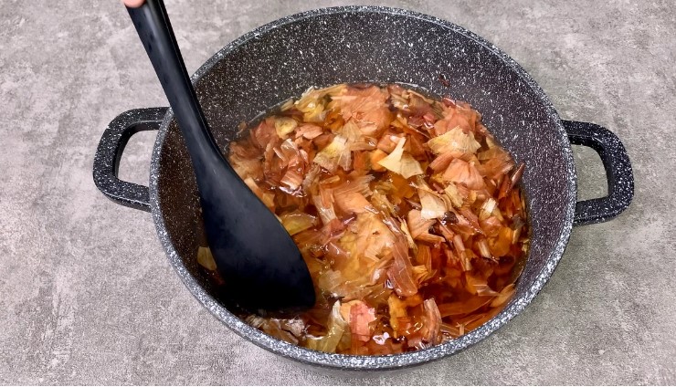 Imediat ce se dizolvă toată sarea, se adaugă cojile de ceapă bine spălate, se lasă la fiert, se fierb exact 5 minute, apoi se ia de pe foc și se răcește complet.