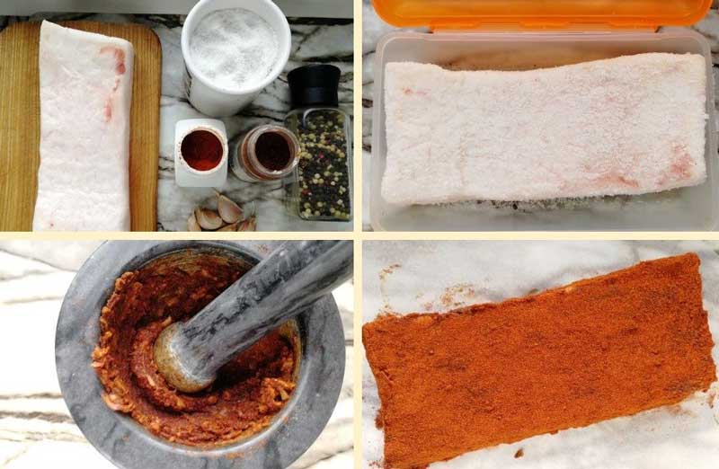 După 3 zile, îndepărtați sarea de pe slănină și pregătiți un nou vas. Îmbăiați uniform slănina în amestecul de paprika și piper chili.