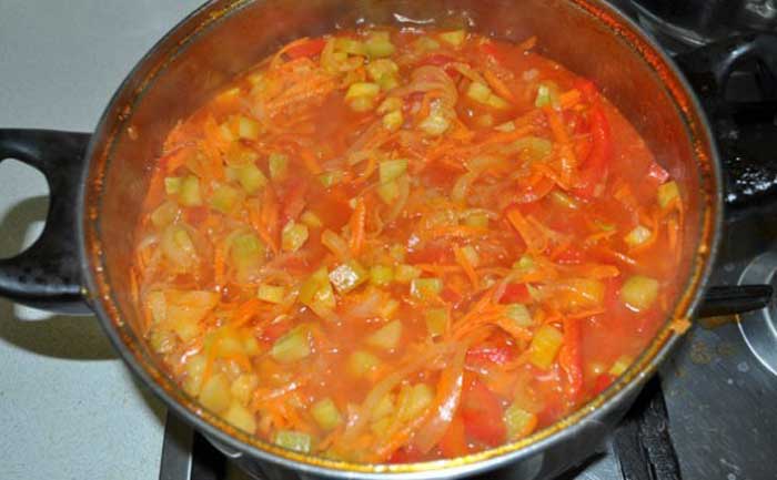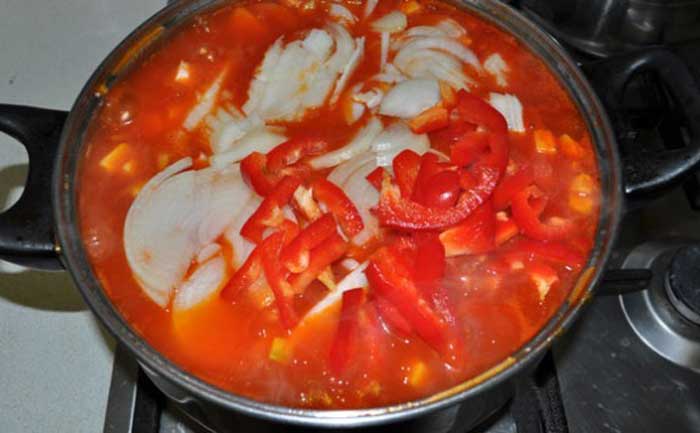 Dupa ce pasta de rosii a fiert, adaugam dovlecelul si dam focul la mic. Amestecam ocazional. Dupa 10-12 minute adaugam ceapa si ardeii. Mai lasam la fiert inca 10-12 minute.