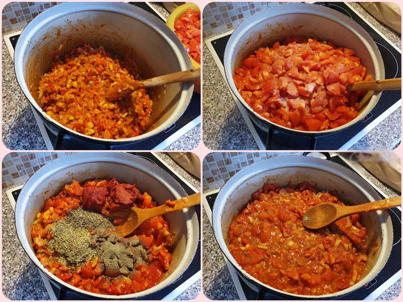 Adăugăm roșiile tăiate, restul de sare, oregano, busuiocul, piperul negru măcinat și pasta de tomate. Amestecăm bine și lăsăm să fiarbă.