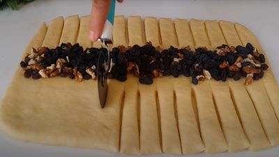După acest timp, întindeți ambele bile de aluat în formă de dreptunghi și ungeți centrul fiecăruia cu puțin unt. Presărați nucile și stafidele în centrul fiecăruia, iar marginile aluatului tăiați-le cu o rotiță pentru aluat în fâșii de aproximativ 1,5 cm lățime.