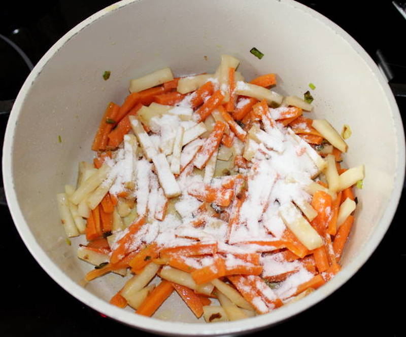 Taiem firul de ceapa si-l prajim intr-o tigaie cu putin ulei de masline. Adaugam sare si piper alb macinat. Taiem morcovii si radacina de telina in fasii. Le adaugam in tigaia cu ceapa si le prajim putin.