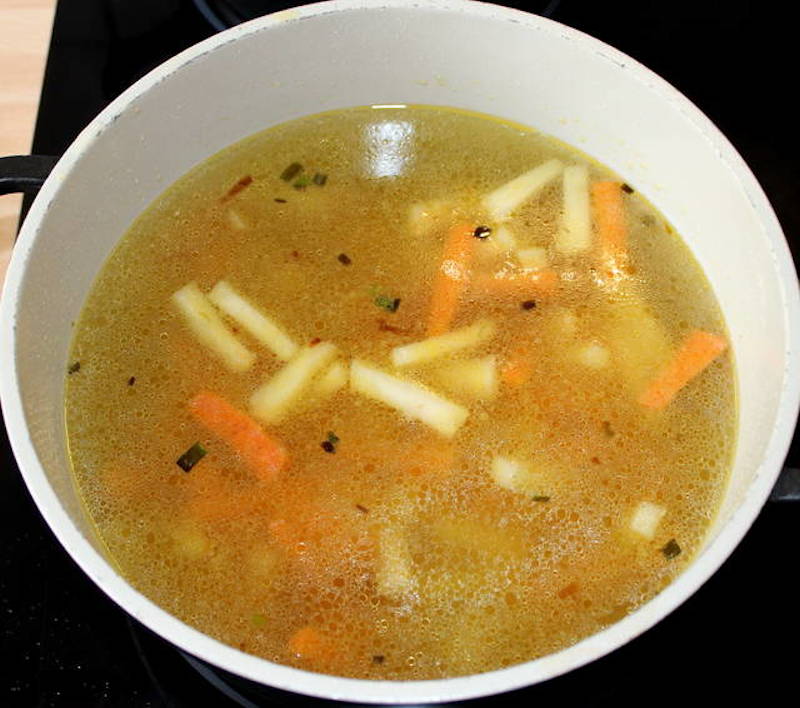 Punem legumele in zeama de la supa. Gatim supa la foc mediu pana cand se inmoaie toate legumele.