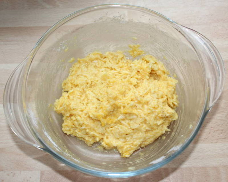 Dam branza gouda pe o razatoare si o punem intr-un bol. Adaugam ouale, faina de grau, nucsoara, sarea si piperul alb macinat. Amestecam bine.