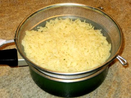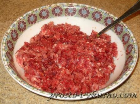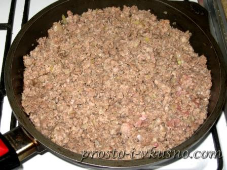 Tocăm ceapa mărunt și o călim în ulei încins, adăugăm carnea și călim totul împreună până carnea își schimbă culoarea. Adăugăm sare și piper.