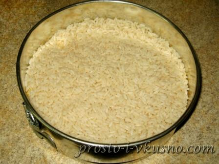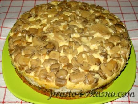 Peste ciuperci punem cașcavalul ras, orezul fiert, carnea cu ceapa și la final mazărea. Turnăm și compoziția de blat și dăm tava la cuptorul preîncălzit la 180 de grade Celsius, timp de 40-45 minute.