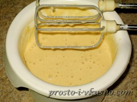 Fierbem mazărea după care scurgem foarte bine de apă. Pentru aluat, mixăm ouăle, adăugăm sare, zeama de lămâie, bicarbonatul, iaurtul, făina și amestecăm până la omogenizare.