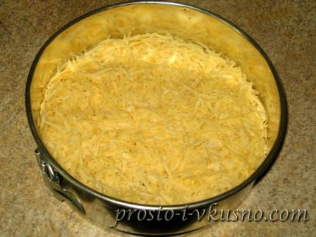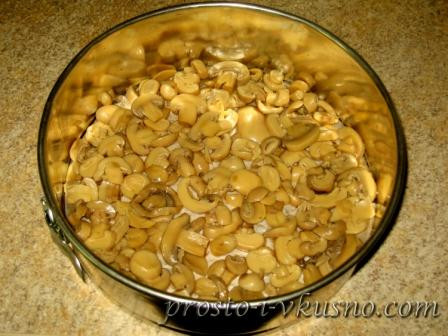 Tapetăm o tavă rotundă, de 23 cm, cu hârtie de copt. Prăjim un pic feliile de ciuperci după care pe punem în tava pregătită.