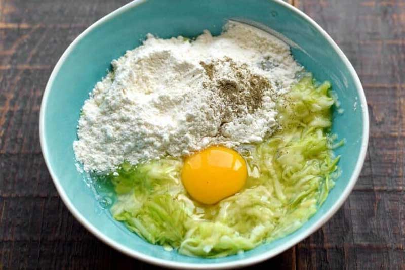 În dovlecei, adaugă ouăle bătute, făina și piperul după gust. Cantitatea de făină poate varia în funcție de cât de suculenți sunt dovleceii. Amestecă bine până obții o compoziție omogenă.