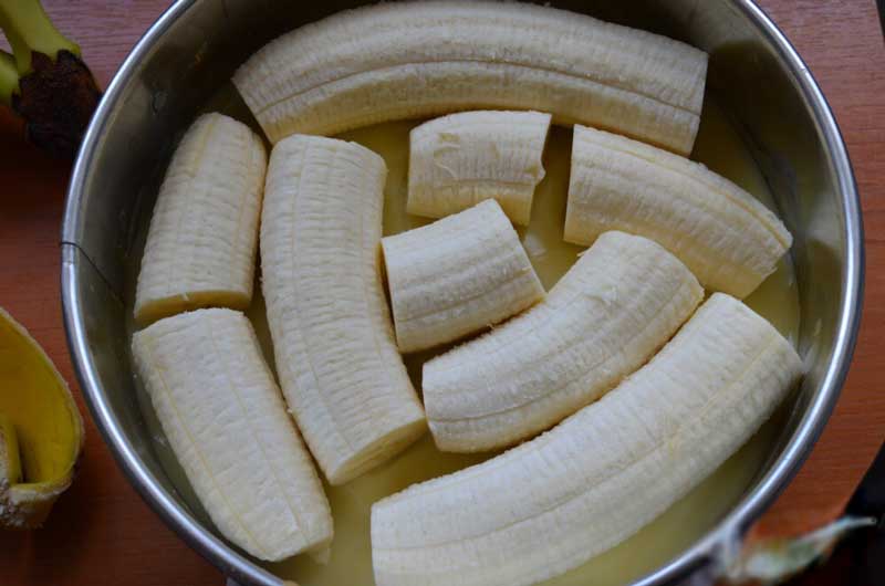Întindeți puțină cremă peste baza de biscuiți, apoi așezați bananele tăiate felii sau bucati mai mari.