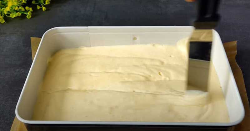 Tapetați o tavă de 28×18 cm cu hârtie de copt și turnați aluatul. Nivelați bine și coaceți în cuptorul preîncălzit la 180°C timp de aproximativ 25 de minute.