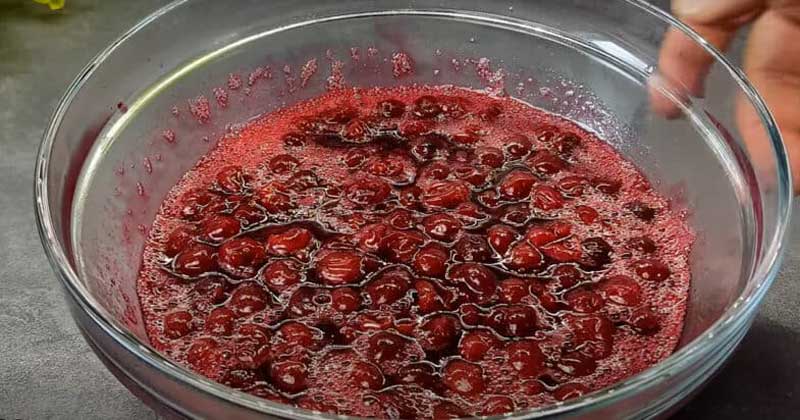 Puneți cireșele într-o cratiță și turnați peste ele apa. Aduceți la fierbere, apoi strecurați lichidul obținut. În acest suc, adăugați praful de jeleu și amestecați bine. Apoi puneți cireșele înapoi în lichid și amestecați din nou. Lăsați să se răcească timp de 15 minute.
