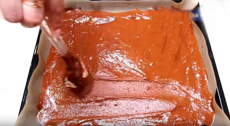 Adăugați făina cu cacao și zahăr și amestecați. Acum adăugați jumătate de linguriță de bicarbonat de sodiu și 1 linguriță de oțet de mere sau suc de lămâie, și amestecați. Tapetati o tavă (32 x 22 cm) cu hârtie de copt și turnați aluatul, nivelându-l.