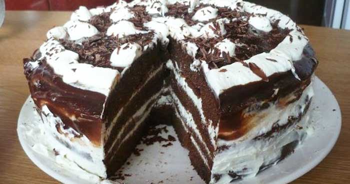 - Pentru a monta tortul, tapetăm un blat cu câteva linguri de cremă, iar pe deasupra adăugăm următorul blat. Procedăm la fel până terminăm toate ingredientele. La final, decorăm cu ciocolată. Se ține la frigider 2-3 ore înainte de servire.