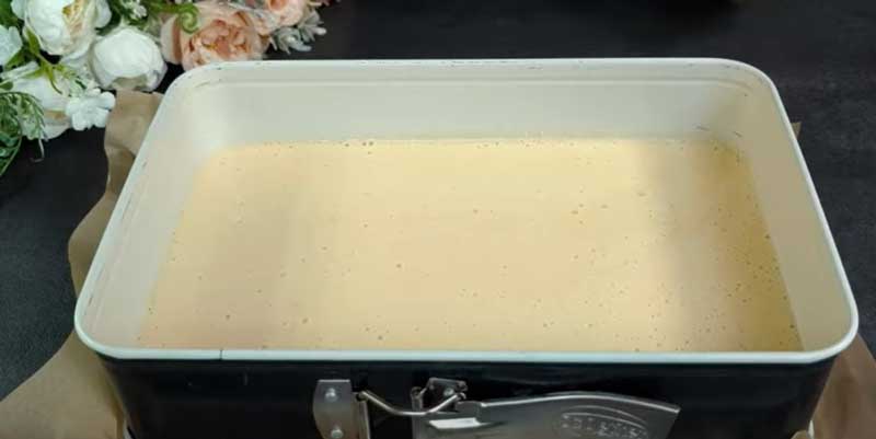 În final, adăugați 40 g nucă de cocos rasă și amestecați din nou. Tava de copt (18×28 cm) tapetați-o cu hârtie de copt și turnați aluatul în ea.