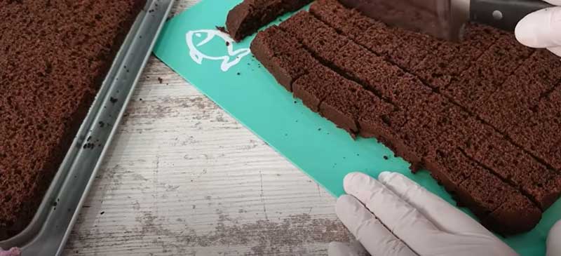 Tăiați blatul copt în două pe lungime. Tăiați o jumătate în pătrate de aproximativ 2,5 cm înălțime. Păstrați marginile blatului deoparte.
