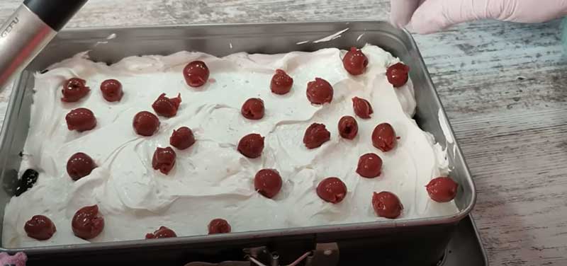 Bateți smântâna pentru frișcă împreună cu mascarpone, vanilie și zahăr pudră într-un mixer. Adăugați smântâna acră și crema de branza la smântâna bătută și amestecați.