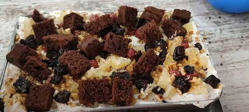 O combinație delicioasă de ananas, prune uscate, nuci și cireșe într-o cremă pufoasă pe un blat de cacao.