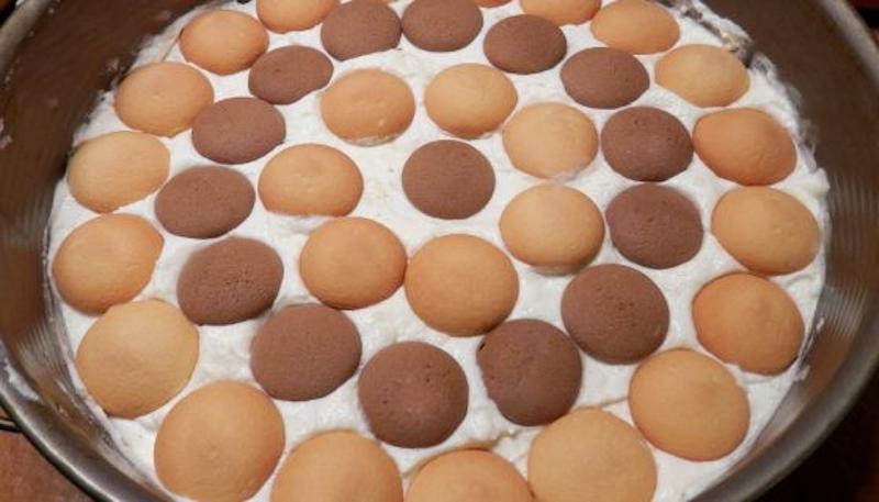 Adaugam deasupra un rand de piscoturi de vanilie, unul de cacao, din nou unul de vanilie si unul de cacao, pana umplem tava. La stropim si pe acestea cu suc din compot.