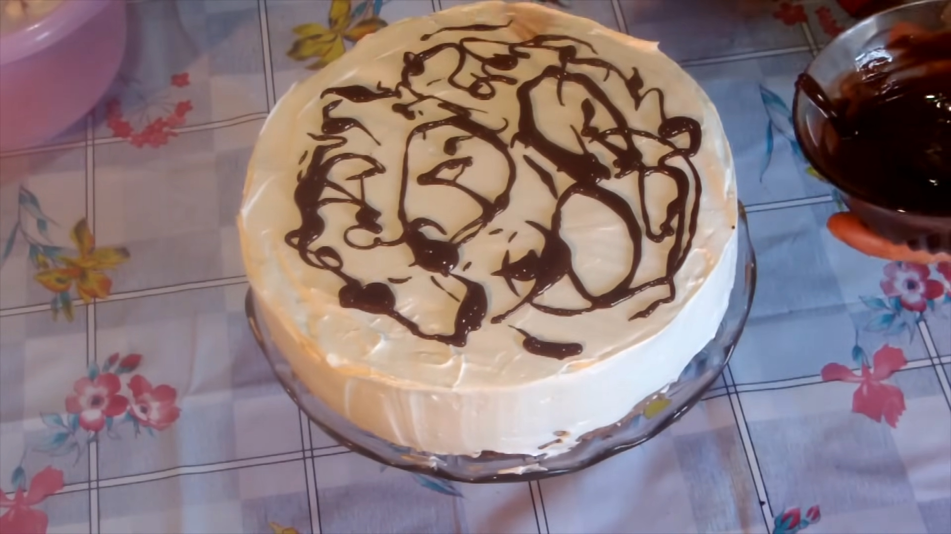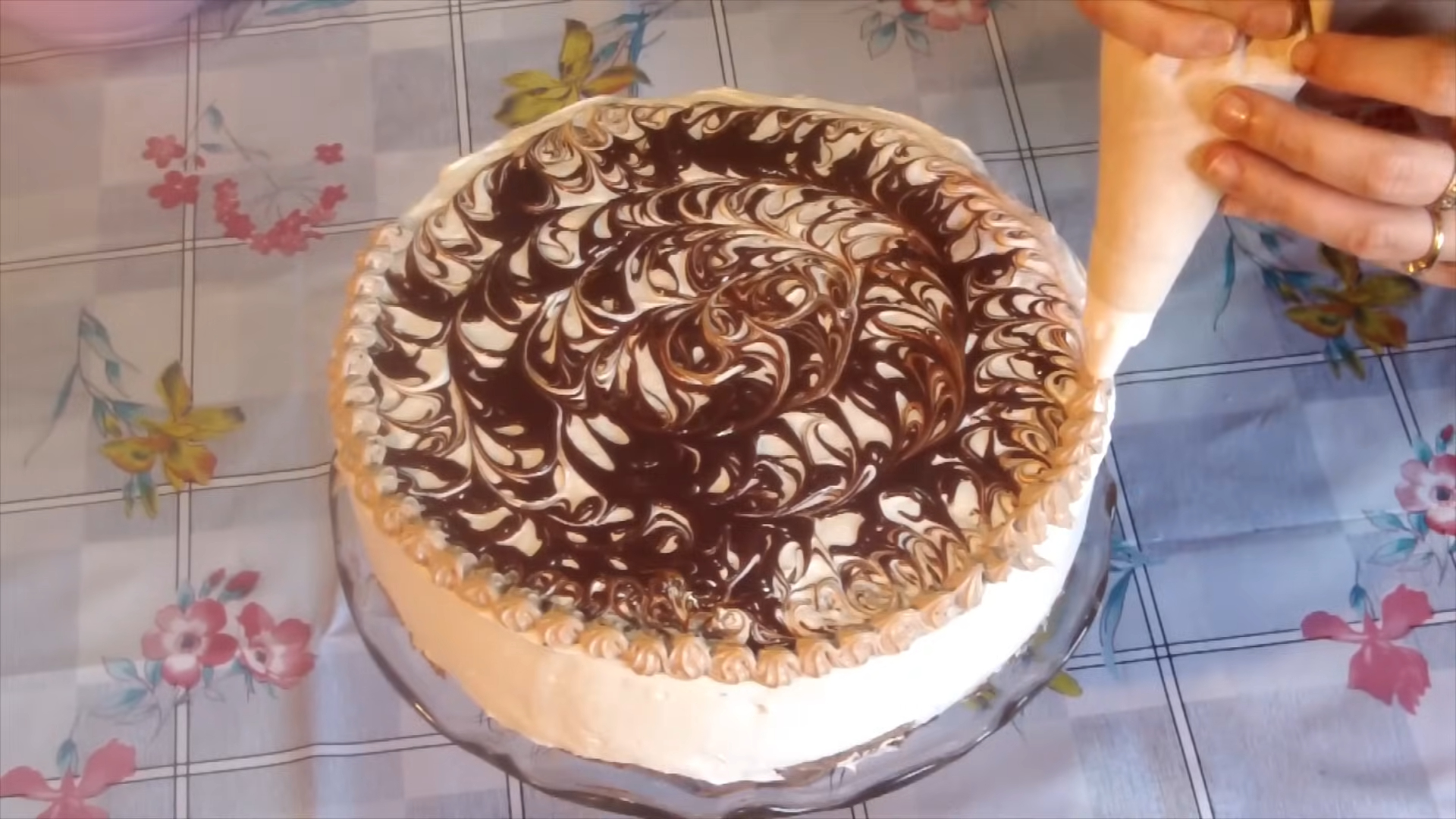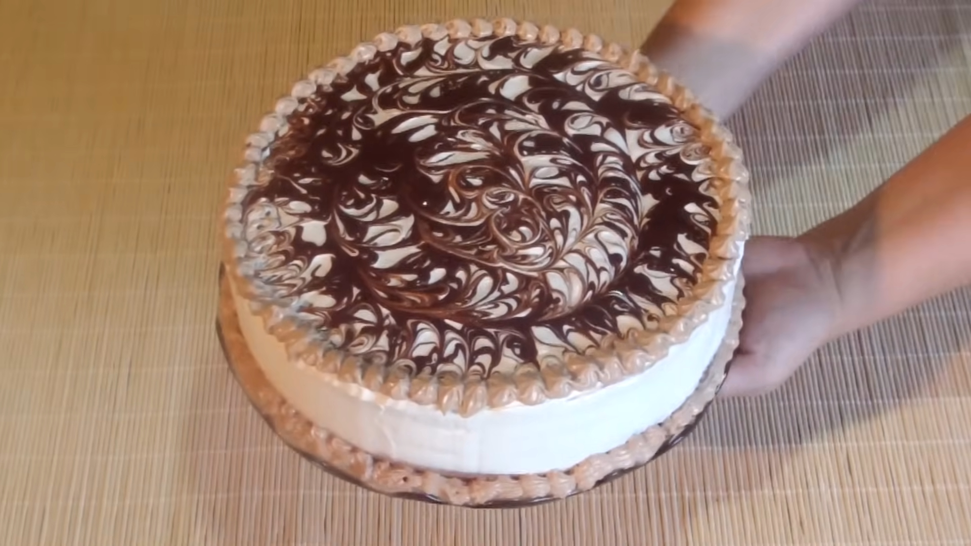 Batem praful de frișcă cu 150 ml de lapte până se întărește. Topim ciocolata și untul la bain-marie. Întindem 3/4 din frișca peste ultimul blat, după ce scoatem tortul din frigider. Ciocolata topită o amestecăm cu frișca rămasă și o folosim la decorarea tortului.
