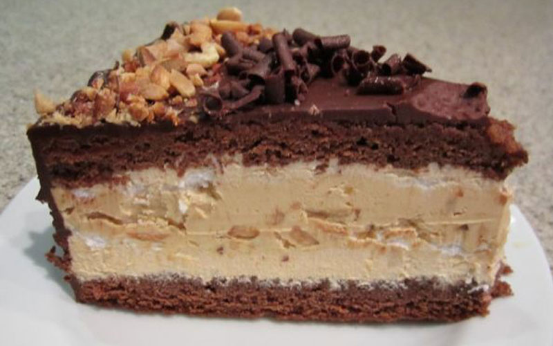 Acoperiți cu a doua jumătate de blat de pandișpan, ornați cu glazură de ciocolată și presărați bucățelele de arahide rămase.