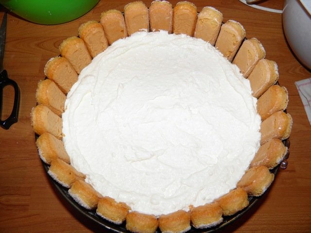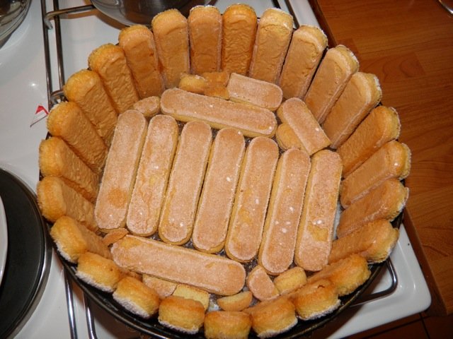 Așezăm restul pișcoturilor la baza formei, formând un blat.