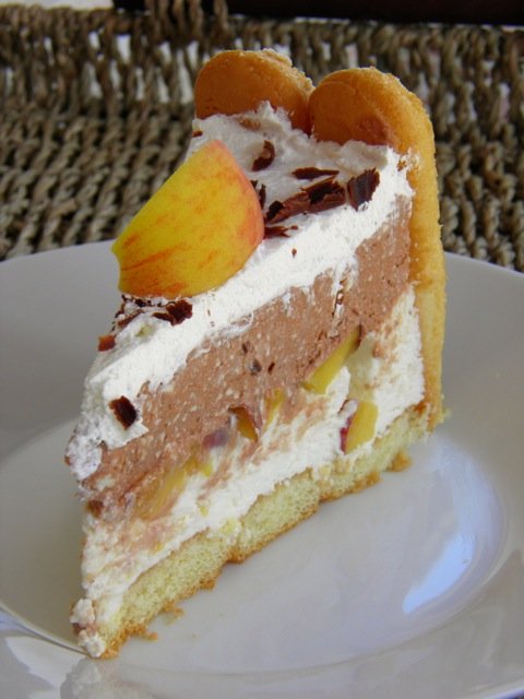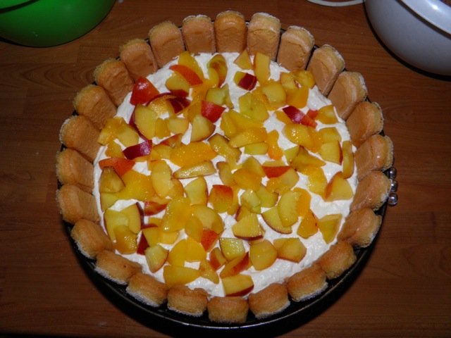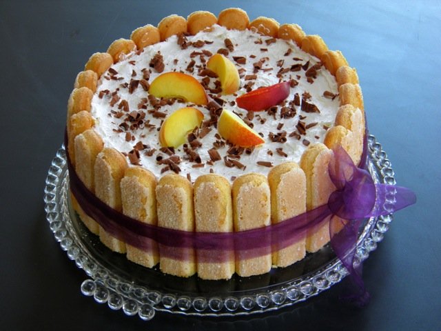Decorăm tortul cu nectarine și frișcă, apoi îl punem la frigider pentru cel puțin 3 ore, după care îndepărtăm marginile formei și servim.