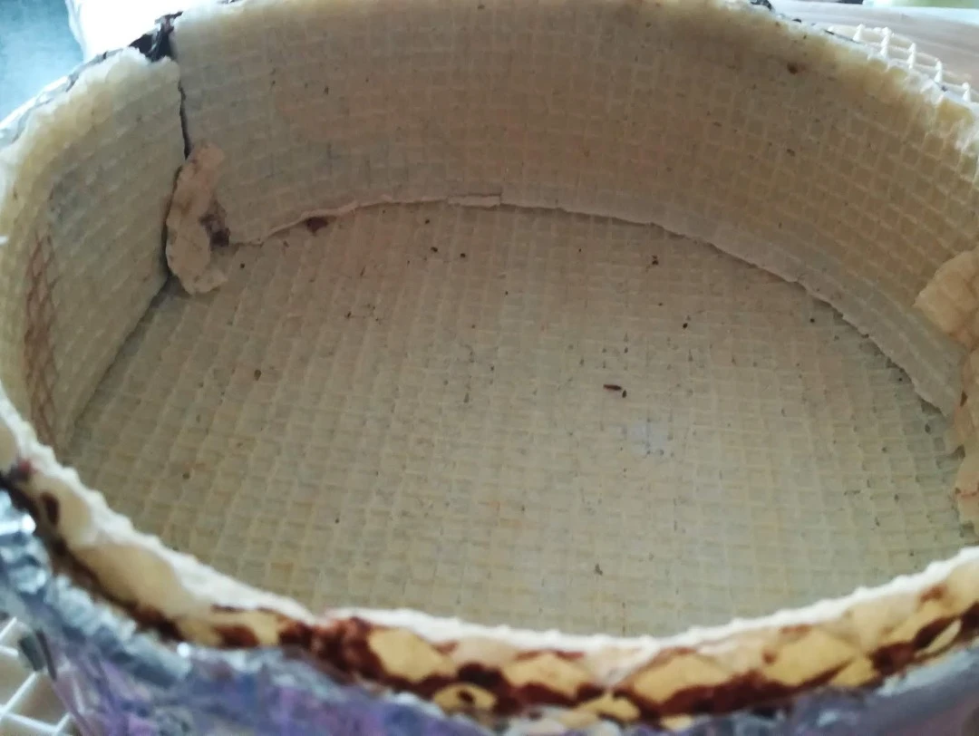 Așezăm tava peste blatul de napolitană și tăiem la mărimea tăvii. Tăiem din blat și pentru marginea formei.