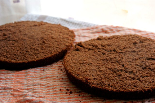 6. După ce s-a răcit, tăiem blatul în 2 părți egale. Tapetăm un blat cu crema pregătită anterior iar pe deasupra adăugăm al 2-lea blat.