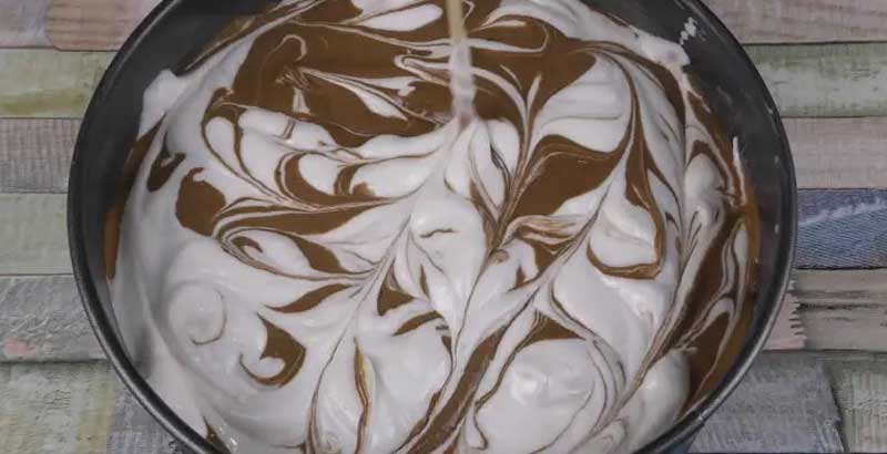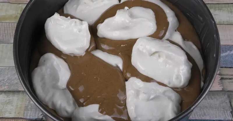 Pun hârtie de copt pe fundul unei forme cu diametrul de 20 cm. Ung marginile cu o bucatica de unt. Așez alternativ aluatul de ciocolată, iar în mijloc aluatul alb. Apoi invers: aluatul alb, iar în mijloc aluatul de ciocolată. Așez aluatul în mod aleatoriu, alternând straturile de aluat alb și de ciocolată.
