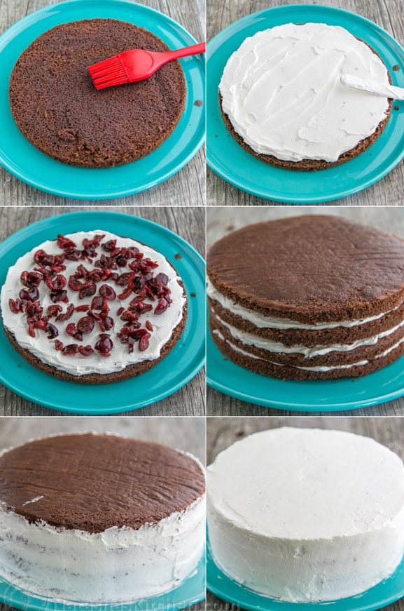 3. Pentru a forma prăjitura, însiropăm un blat pe care îl tapetăm cu frișcă. Adăugăm un strat de vișine și mix de cirese(rosii si amărui). Așezăm a 2-a foaie însiropată pe care o tapetăm cu frișcă și mixul de cirese si visine. Completam cu cea de-a treia foaie de blat pe care o insiropăm.