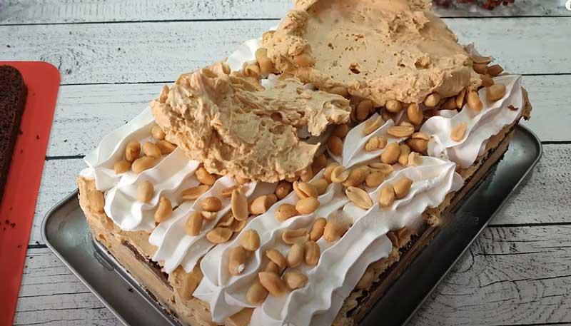 Tăiați blatul în trei părți egale. Dacă este necesar, ajustați marginile. Puneți primul blat pe un platou, acoperiți cu cremă, presărați cu arahide mărunțite – bezele – si continuati la fel pana terminati blaturile.