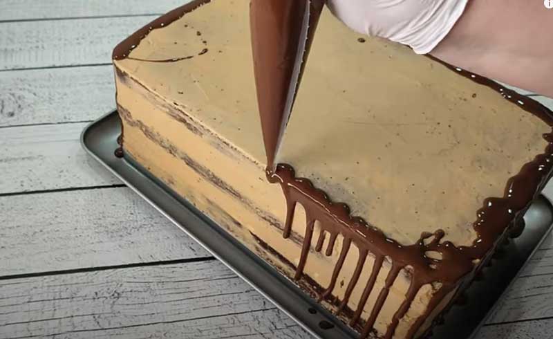 Ungeți părțile laterale ale tortului cu un strat subțire de si ornati cu ciocolata. Puteti insiropa blaturile cu un sirop simplu de apa si zahar.