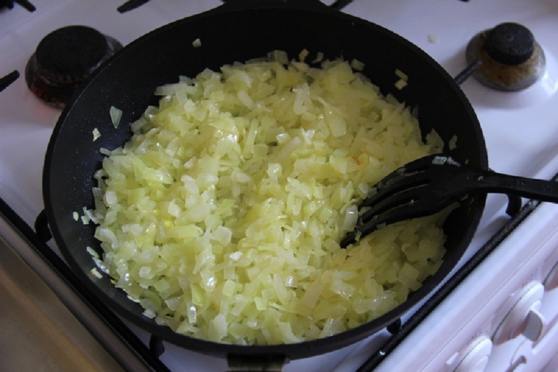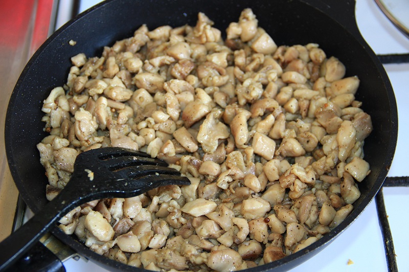 1. Se taie ceapa și se prăjește în ulei, pe foc mare. Tăiați puiul bucățele mici, le adăugați în tigaie și gătiți timp de 5 minute.