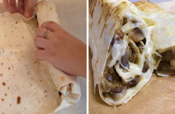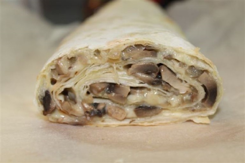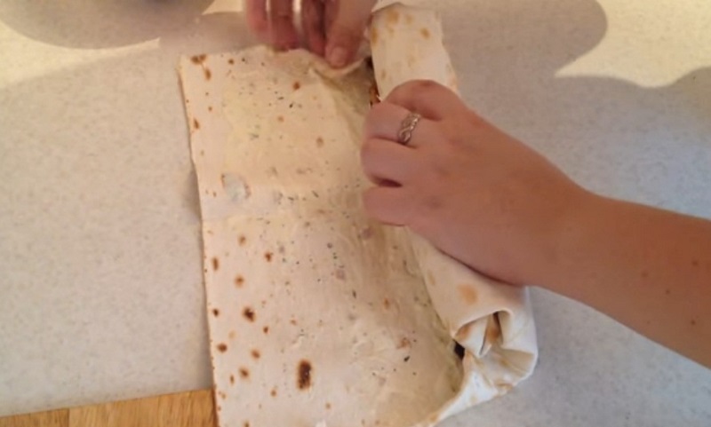 4. Puneți un sfert din umplutură pe fiecare lipie, pe urmă rulați.
