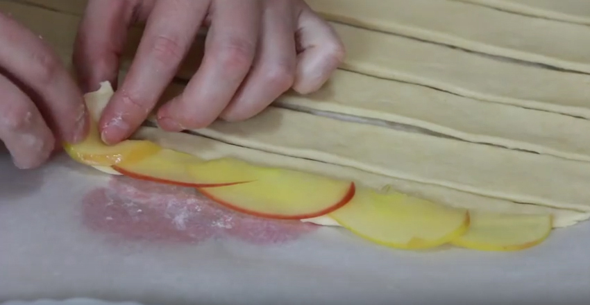 Scoatem merele din sirop și le lăsăm la răcit. Întindem aluatul foietaj și îl tăiem fâșii subțiri.