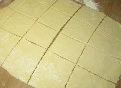 Se acoperă și se lasă la dospit într-un loc cald timp de aproximativ 30 de minute. După ce aluatul a crescut, se rupe o bucată, se întinde destul de subțire și se taie în pătrate.