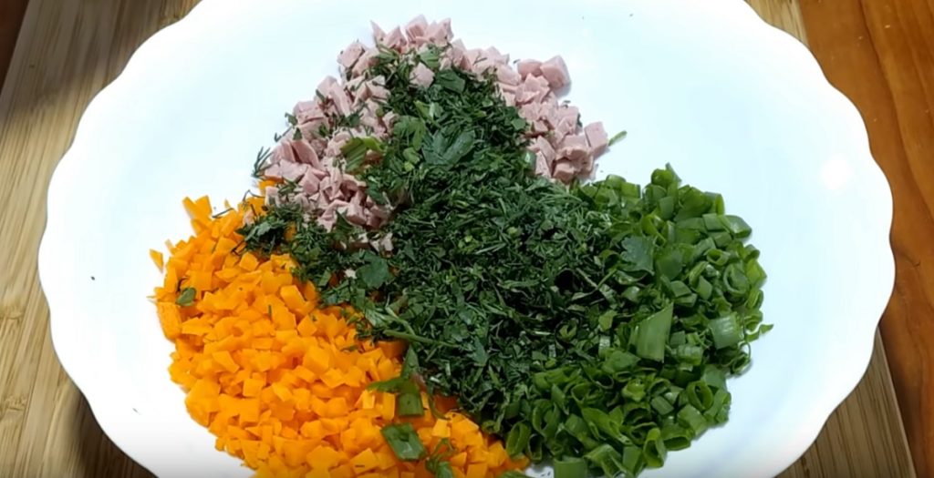 Curățăm, spălăm și tăiem morcovul în cubulețe. Tăiem mărunt și șunca, mărunțim ceapa, mărarul și pătrunjelul.