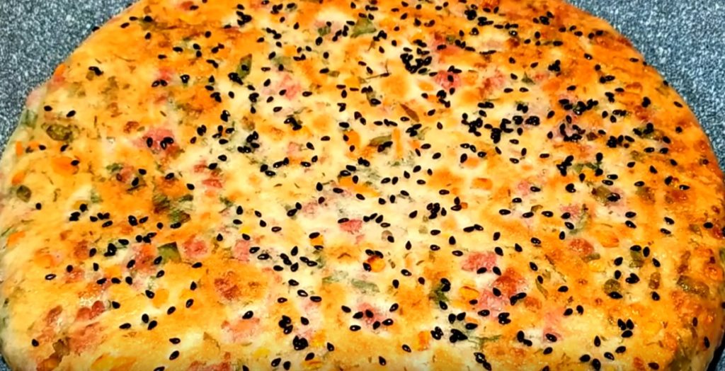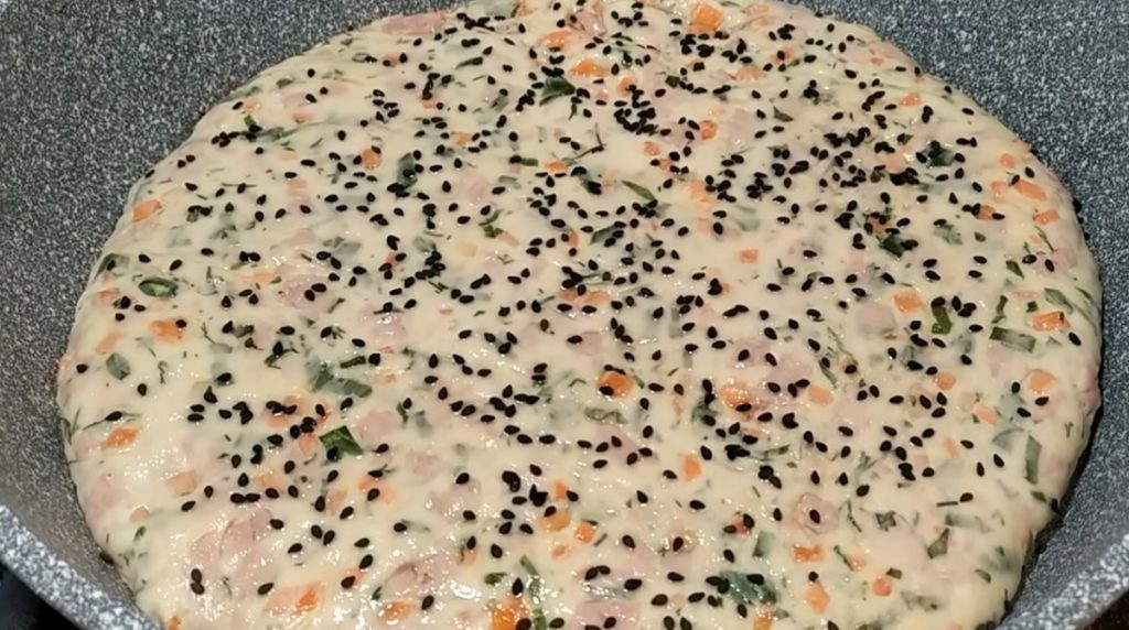 Ungem o tigaie cu ulei și transferăm turta în ea, cu „cusătura” în jos, presărăm cu semințele de susan și punem tigaia pe foc mediu.