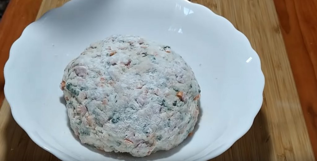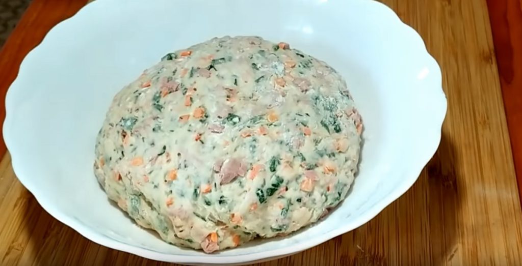 Tapetăm suprafața de lucru cu făina, transferăm aluatul pe ea, îl mai frământăm un pic, apoi formăm un baton.
