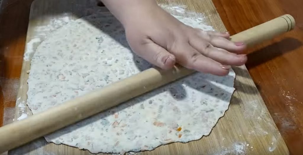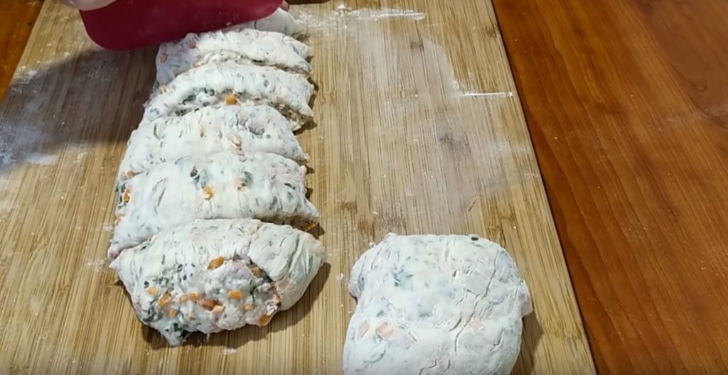 Partea mai mică o tăiem în 6, apoi modelăm tot atâtea bile, și le întindem, rând pe rând, în formă rotundă și subțire.